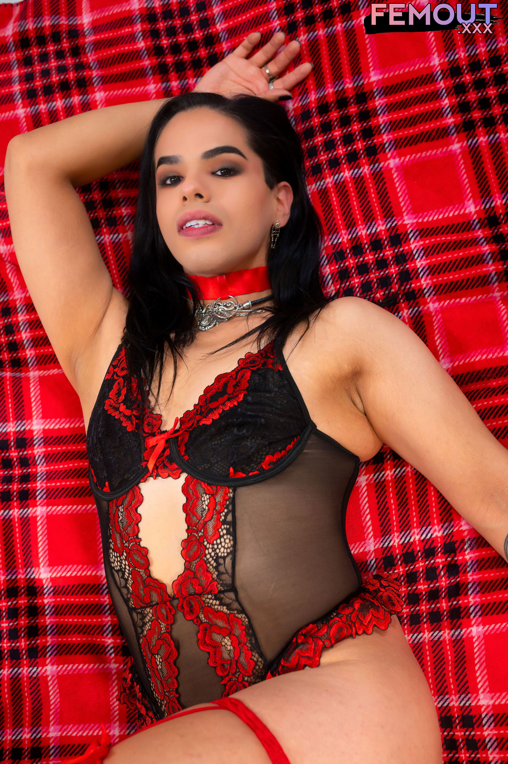 Not bad, as in, she's not good sex, but bad as in, if you were in bed with Demoness, you know bad things are good to happen, and you are going to love it all. Sexy black and red lingerie with a red choker, which all match her look and vibe - but once she's got us excited showing herself off, she wants to get herself excited and strips down, her uncut cock hard and sticking out straight from her...